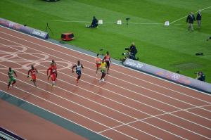 100-meter heat, Bolt just looking for friends in the stands!