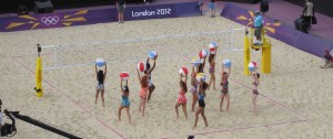 Beach Volleyball takes place in Horse guards parade, just down the road from the Queen’s humble abode. The Union Jack and the Olympic flags are lining the Mall. There are sand sculptures, practice courts and statues of famous volleyball athletes all around St. James’s Park. The main arena fits 15,000 spectators. Dancers in beachwear perform during timeouts and breaks, music plays the whole time and the announcer keeps the crowd laughing. Gamesmaker rakers even out the sand when needed and keep the court’s pink border visible.