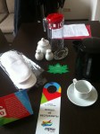 The first surprise was when I opened the door the other night and walked right smack into my new coat rack. The next night, a coffee pot and cup, then slippers and last night a do not disturb sign. In the gallery you can see my little kitchen, side-by-side twin beds and my view.