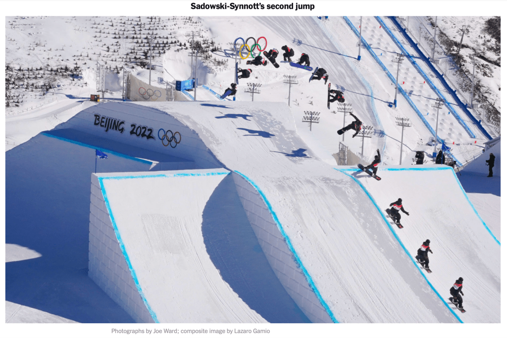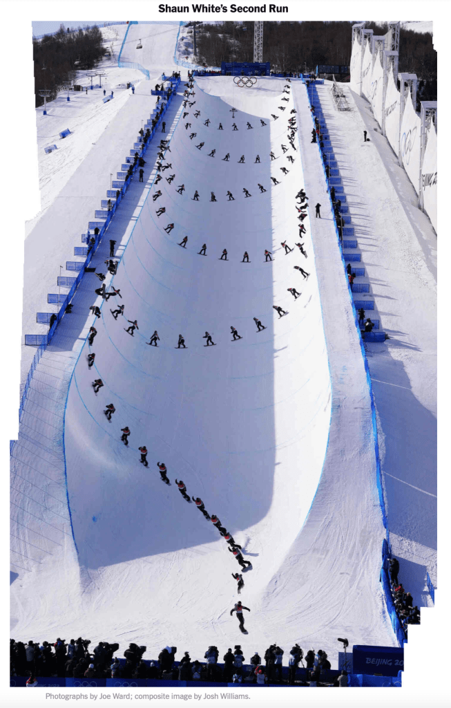 I took this sequence of Shaun White’s second run, the last full Olympic run before retiring from Olympic competition. Thankfully, no crampons needed to get to the broadcast platform above the stands. Just a lot of stairs.