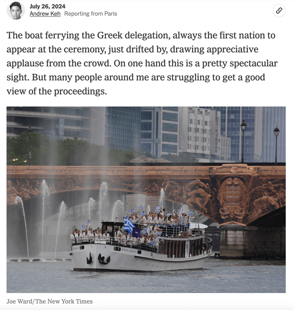 This particular ceremony was, of course, different than any I‘ve been to. A stadium and a ”walking“ Parade of Nations was replaced by a river and a parade of boats.