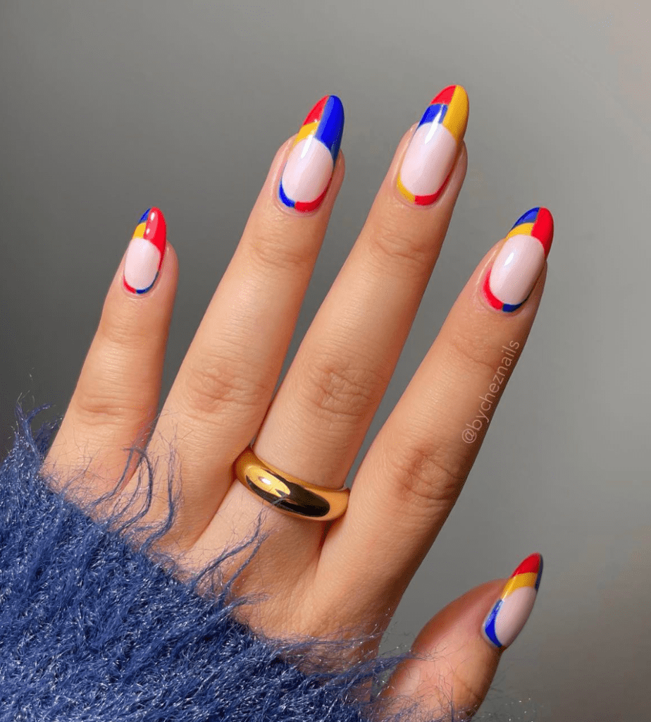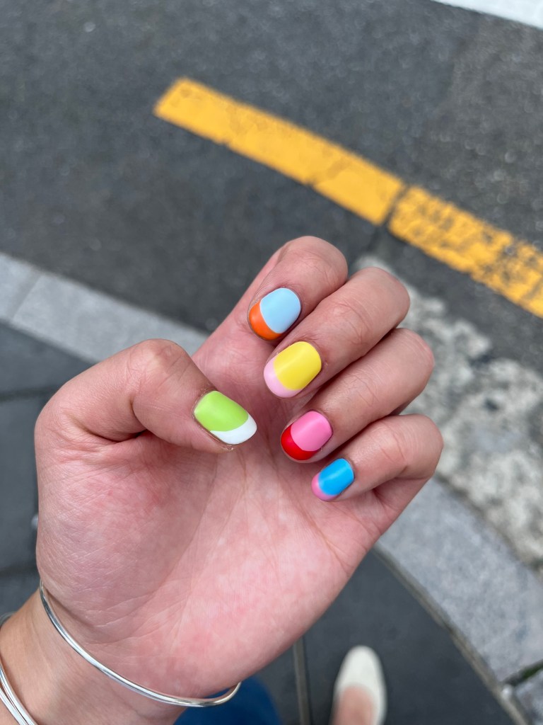 I thought maybe I can just do French tips with each color on each finger, then I thought it was not exciting enough. Then I found a design on Instagram by @bycheznails that I had saved (yes I have an Instagram folders of nail designs). It’s five blocks of colors on each finger and a twist of the classic French tip, it’s subtle yet fits the theme, everything clicked!