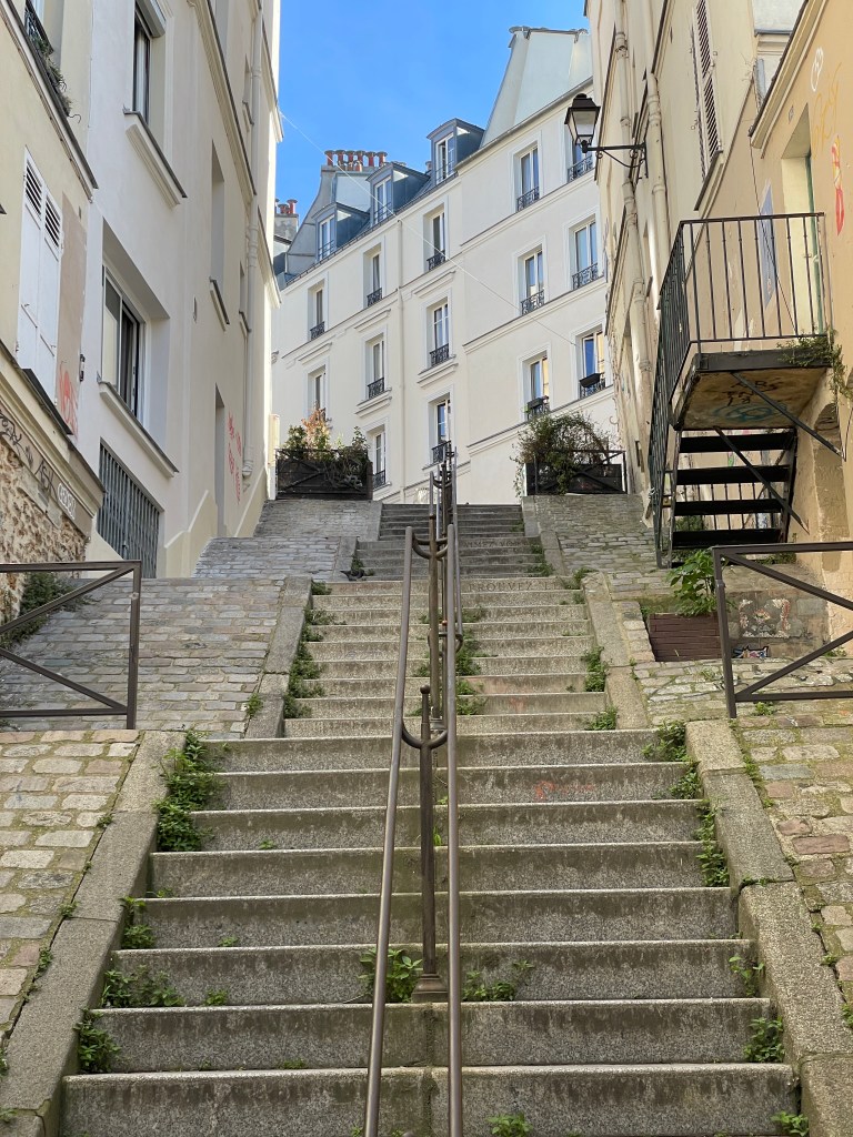 Take the Metro #12 to the Abbesses station. Climb an endless circular staircase until you begin to see daylight. Only a few more flights from there. When you emerge, you may, as I did, hear church bells.