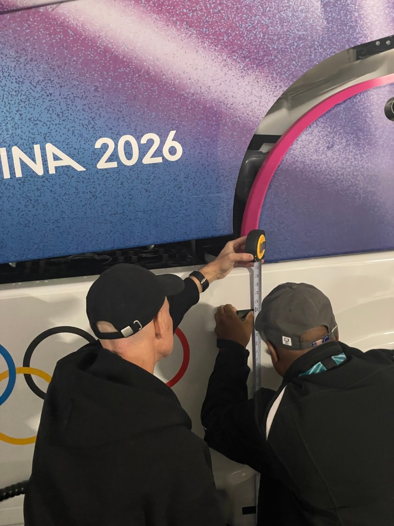 We needed measurements at different heights all over the ice, so with the blessing of the Ice Meister (the real one) we placed black tape at intervals on the side of the Zamboni and then took 600 photos from three positions as it resurfaced the ice. Then Jeremy slid along the ice with a measuring pole that he built at home out of pvc and carried to Milan is a ski bag. When we showed up at figure skating with a ski bag, they told us we were at the wrong venue. Unfortunately for them, we weren’t. We proceeded to take 600 more photos of the pole. All so we can build a precise virtual 3D grid on top of the rink to measure how high he jumps. Also had to use a laser to measure how far the photo positions were from each other.