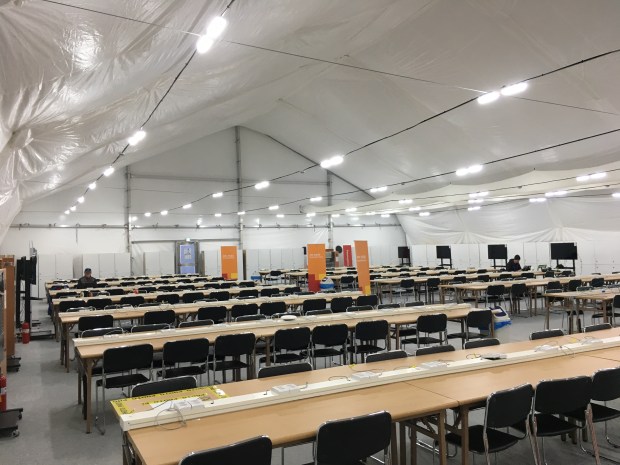 Very diligent or very slow. Bill Pennington (NYT) on the left, Jeremy White (NYT) on the right. the last two in the media tent after the women’s downhill.
